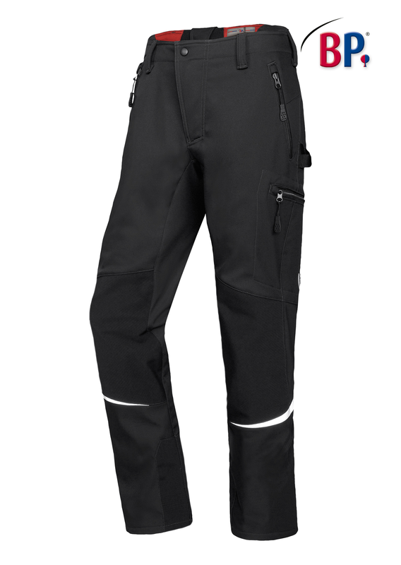 BP® Softshellhose für Herren, Schlanke Silhouette, Dehnbund im Rücken für optimalen Sitz, ergonomischer Schnitt, D-Ring, Hammerschlaufe, 2 mit Reißverschluss verschließbare Seitentaschen, 1 Gesäßtasche mit verschließbarer Taschenklappe, bessere Sichtbarkeit durch Reflexelemente am Bein, 1 geräumige innenliegende Schenkeltasche mit integrierter Smartphonetasche, verstärkte freihängende doppelteZollstocktasche, Cordura®-Besätze an Knöchel und Knie, Größe: 48N, Farbe: schwarz