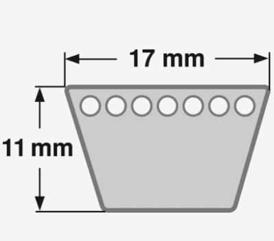 Klassische Keilriemen ummantelt, Profil B/17. Die klassischen Keilriemen sind kraftschlüssige trapezförmige Treibriemen aus Neopren mit Textilummantelung und Polyesterzugstrang, deren Kraft in den Flanken übertragen wird. Sie finden ihren Einsatz überwiegend im Maschinenbau.