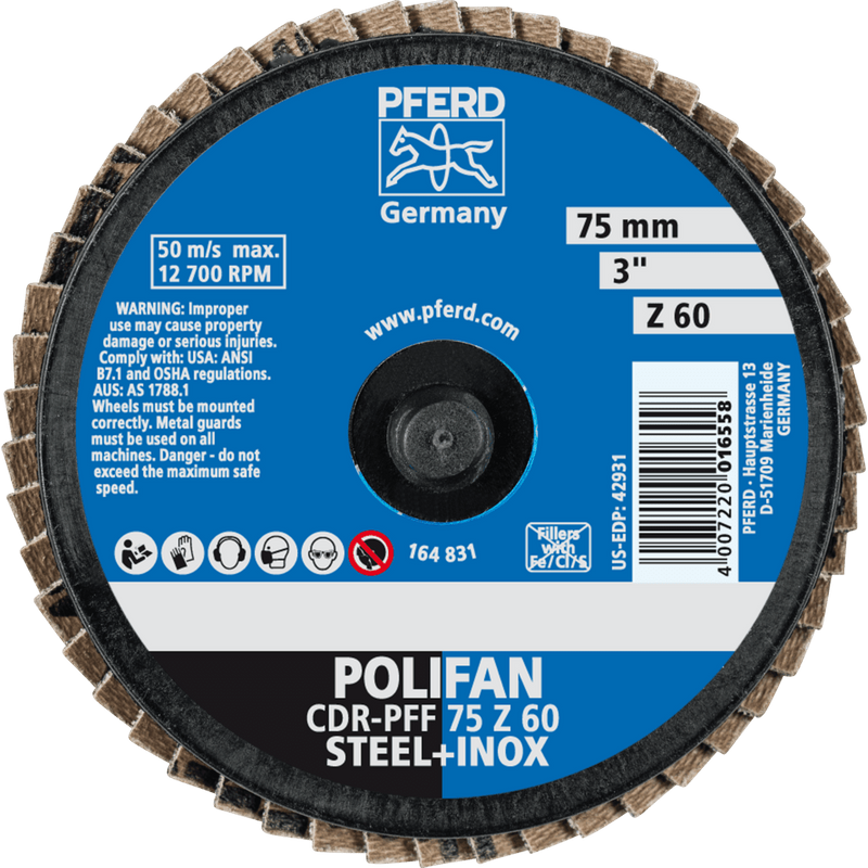 PFERD COMBIDISC-Mini-POLIFAN CDR PFF 75 Z 60 - Schleifmittel: Zirkonkorund Z - Das Aufspannsystem CDR verfügt auf der Werkzeugseite über eine Schraubverbindung mit Außengewinde (Kunststoff). Auch passend zu den im Markt eingesetzten Systemen: Roloc™, Lockit, Speed Lok TR, Power Lock Typ III, Fastlock-System B, Roll-On. Für grobe Schleifaufgaben bei hoher Abtragsleistung und hoher Standzeit. • Hohe Wirtschaftlichkeit durch schnellen Werkzeugwechsel. • Hoher Komfort durch einfache Handhabung und vibrationsarmes Arbeiten. • Keine Störungen im Einsatz durch Kleben, Verrutschen oder Lösen. • COMBIDISC-Mini-POLIFAN mit Werkzeughalter auf Biegwellenantrieben mit Winkelhandstück, kleinen Druckluft- oder Elektrowinkelschleifern einsetzen. • Für den Werkstoff geeignetes Schleiföl verwenden, um die Standzeit und Schleifleistung der Werkzeuge deutlich zu erhöhen. • Bei erhöhtem Anpressdruck verwenden. • Aufrauen • Egalisieren • Entgraten • Flächenbearbeitung • Kantenbearbeitung • Schweißnahtbearbeitung • Schärfen • Stufenweises Feinschleifen • Werkzeughalter bitte separat bestellen. • Die maximal zulässige Umfangsgeschwindigkeit beträgt 50 m/s. • Die angegebene maximal zulässige Drehzahl darf aus Sicherheitsgründen nie überschritten werden.