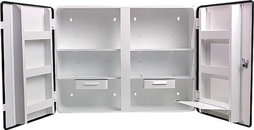 SÖHNGEN Verbandschrank LONDON B604xH462xT170ca.mm weiß 2-türig · aus Stahlblech, weiß · 2-türig · Sicherheitsschloss, 2 Schlüssel · 4 Einlegeböden, 2 Schubladen · Türen mit je drei Ablageschalen · Montagematerial, zusätzlich klappbares Ablagetableau zur hygienischen Zwischenlagerung von Verbandmaterial bei der Erste Hilfe Leistung · erweiterbar durch 1 Medikamentenfach, 2 Zusatzböden und bis zu 4 Schubladen Eigenschaften: • Material: Stahlblech geeignete Füllung nach DIN 13169 s. Art.-Nr. 4000 386 103