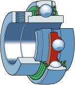 Spannlager, Baureihe YEL2..2F, mit Exzenterringbefestigung, beidseitig verbreiterter Innenring, Berührungsdichtung, NBR, vorgeschaltete Schleuderscheibe, auf beiden Seiten.